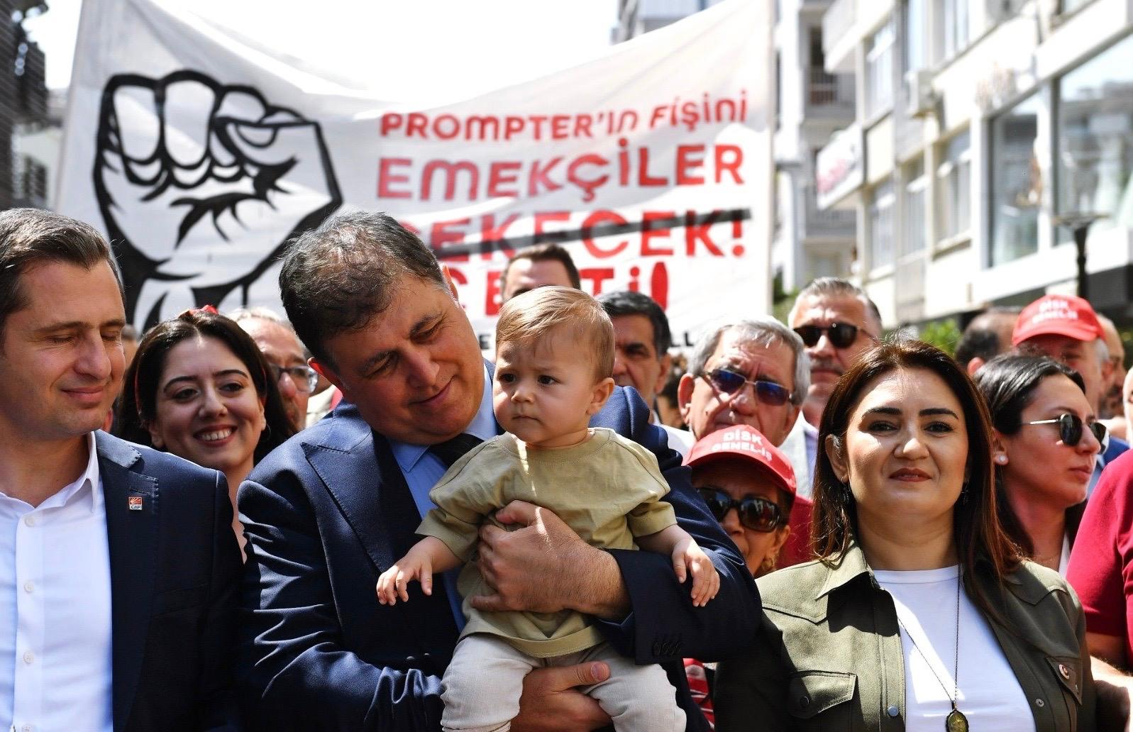 CHP İzmir İl Başkanı Şenol Aslanoğlu ise CHP örgütlerinin sadece bugün değil, bugüne kadar emek mücadelesi neredeyse orada olduğunu belirterek, "Bugünden sonra da işçinin, emekçinin, emeklinin yanında olmaya devam edecekler. Ta ki gasp edilen hakları geri alana kadar" ifadelerini kullandı. Açıklamanın ardından kortej, yürüyüşünü sürdürdü. Gündoğdu Meydanı'na kadar yürüyen Başkan Tugay, burada emekçilerle sohbet ederek, fotoğraf çekildi. Program, saygı duruşuyla başladı ve İstiklal Marşı'nın okunmasıyla devam etti. 1 Mayıs'ta hayatını kaybedenlerin yanı sıra maden kazalarında, depremlerde yaşamını yitirenler için de bir dakikalık saygı duruşunda bulunuldu.