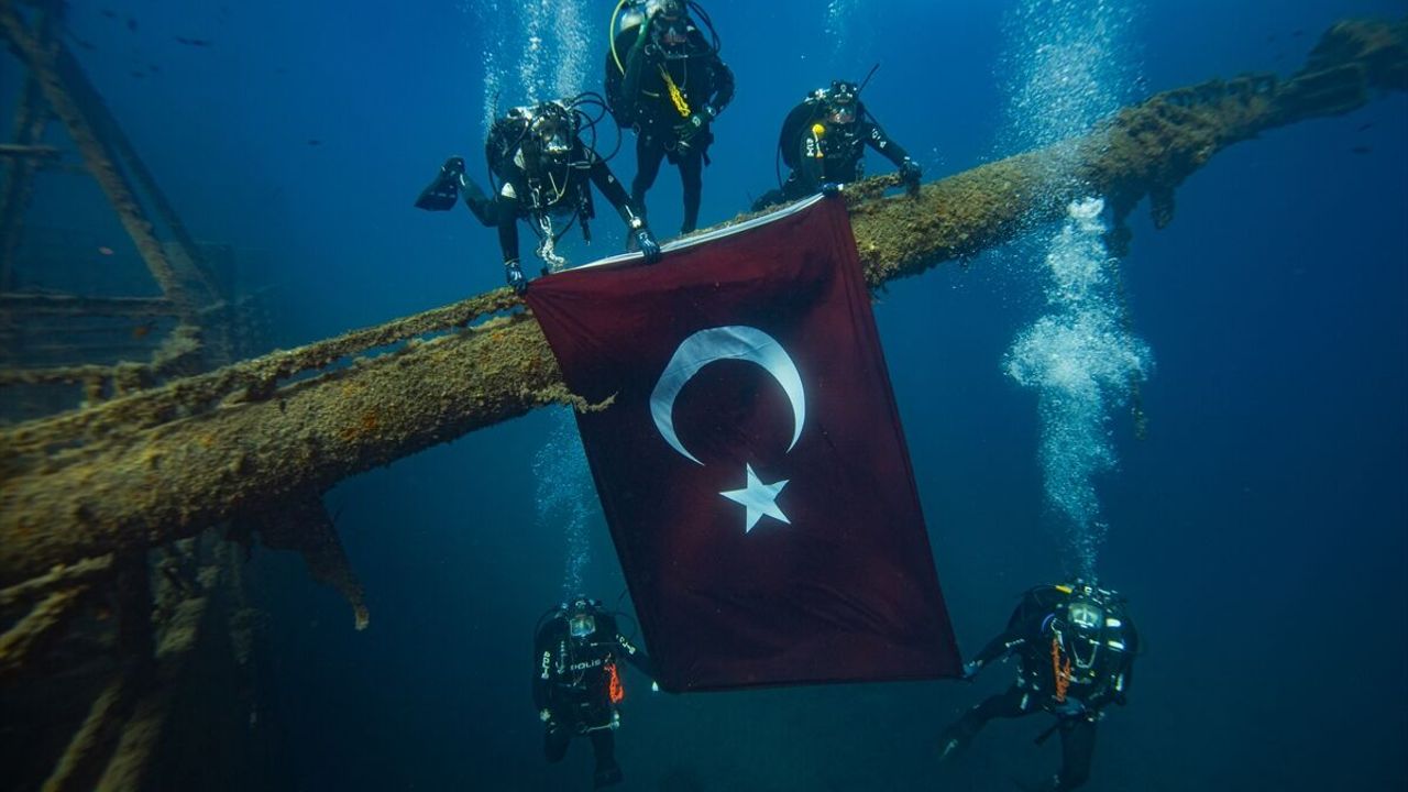 Dalgıçlar, batığa ulaştıktan sonra su altında Türk bayrağı açarak Cumhuriyetin 102. yılını selamladı. Kırmızı beyaz bayrağın su altındaki dalgalanışı kameralara yansıdı. Bu duygu dolu anlar, hem su altından hem de dron ile havadan görüntülendi.