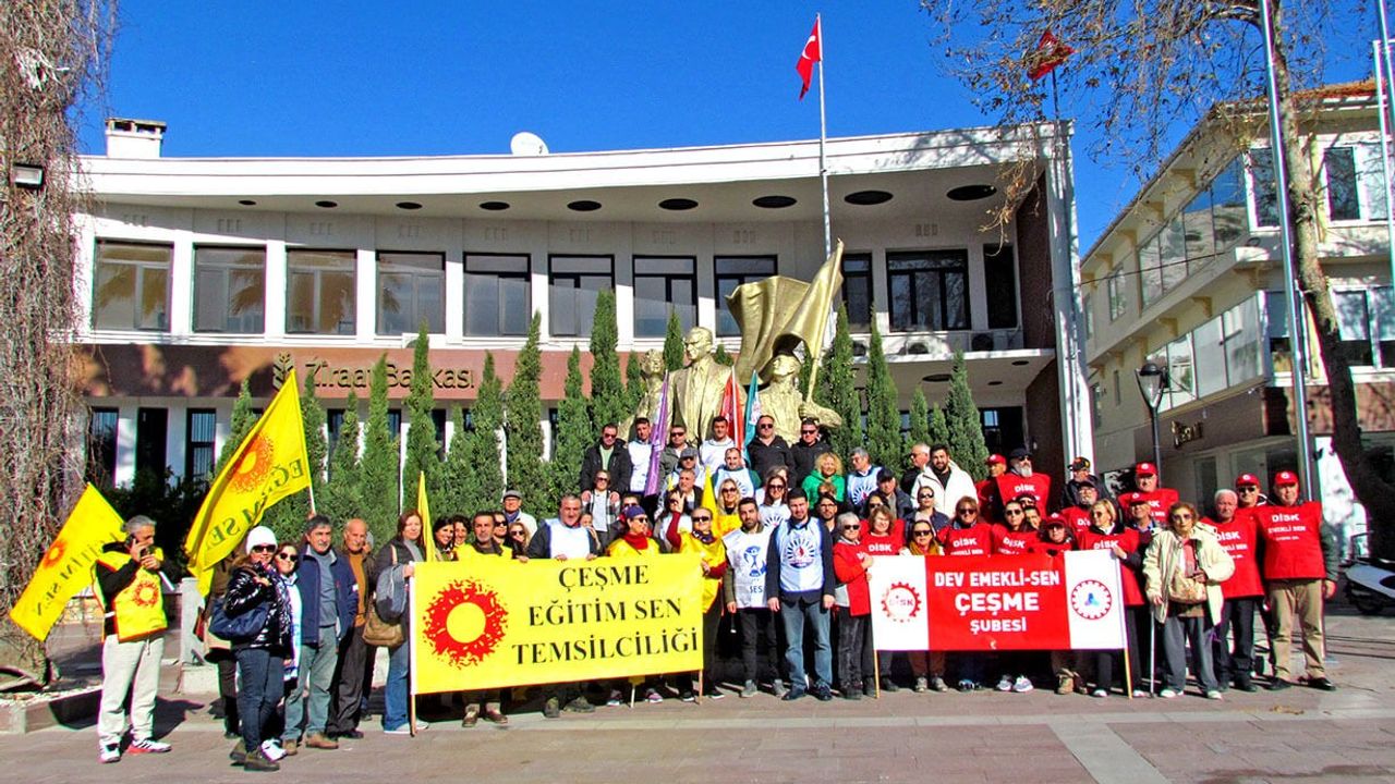 Son Mühür/ Osman Günden - KESK’in ülke genelinde aldığı karar doğrultusunda Çeşme’de kamu emekçileri 14 Ocak Çarşamba günü iş bıraktı. Cumhuriyet Meydanı’nda yapılan basın açıklamasına Eğitim-Sen, Tüm Bel-Sen ve Sağlık ve Sosyal Hizmet Emekçileri Sendikası (SES) Çeşme Temsilcilikleri üyesi kamu emekçileri katıldı. DİSK Dev-Emekli-Sen Çeşme Temsilciliği üyeleri de eyleme destek verdi.