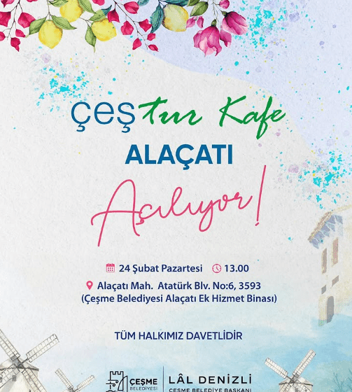 Çeşme Belediyesi, ilçeye yeni bir sosyal alan kazandırmak için hazırlıklarını sürdürüyor. Belediye bünyesinde hizmet verecek olan ÇeşTur Kafe Alaçatı, doğayla iç içe huzurlu bir ortamda hem bölge halkını hem de ziyaretçileri ağırlayacak. Alaçatı Ek Hizmet Binası'nın bahçesinde yer alacak olan kafenin açılışı, 24 Ocak Pazartesi günü saat 13.00'da gerçekleşecek. Belediye tarafından işletilecek olan ÇeşTur Kafe, kaliteli hizmet anlayışıyla hem yerel halkın sosyalleşebileceği bir alan hem de turistler için cazip bir dinlenme noktası olmayı hedefliyor.