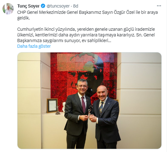 CHP'de yeni dönemde koltuğunu korumayı başarıp başaramayacağı merakla beklenen İzmir Büyükşehir Belediye Başkanı Tunç Soyer rotasını başkent Ankara'ya çevirdi. CHP Genel Merkezi'nde Özgür Özel'i ziyaret eden Soyer sosyal medyadan 'CHP Genel Merkezimizde Genel Başkanımız Sayın Özgür Özel ile bir araya geldik. Cumhuriyetin ikinci yüzyılında, yerelden genele uzanan güçlü irademizle ülkemizi, kentlerimizi daha aydın yarınlara taşımaya kararlıyız. Sn. Genel Başkanımıza saygılarımı sunuyor, ev sahiplikleri için teşekkür ediyorum' mesajını paylaştı.