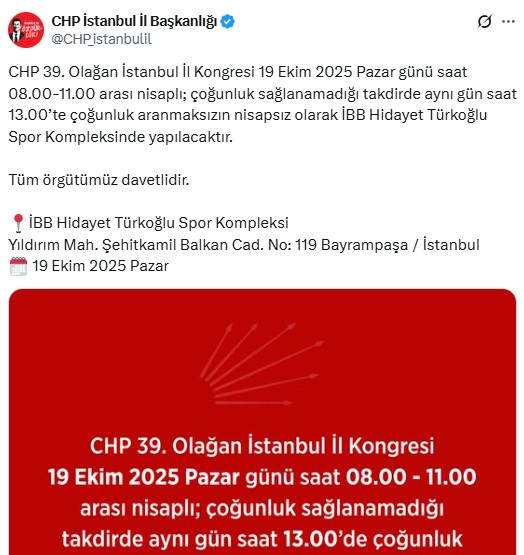 CHP İstanbul İl Başkanlığı’nın sosyal medya hesabından yapılan açıklamaya göre kongre, 19 Ekim 2025 Pazar günü Bayrampaşa’daki İBB Hidayet Türkoğlu Spor Kompleksi’nde yapılacak.