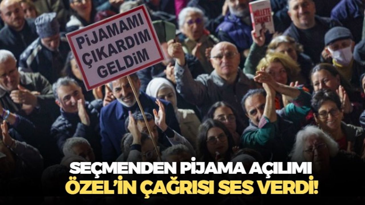 Coşkulu bir kalabalığa seslenen Özgür Özel'i dinlemeye koşanlar arasında elinde taşıdığı dövizde, ''Pijamamı çıkardım geldim'' yazan bir vatandaş dikkati çekti.