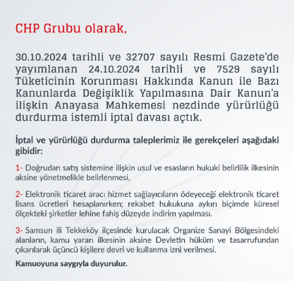 ''Tüketicinin Korunması Hakkında Kanunun Anayasa’ya aykırı hükümlerinin yürütmesinin durdurulması öncelikle ve her halükarda iptali için AYM’ye dilekçemizi sunmuş bulunuyoruz CHP Grubu olarak. Geçenlerde TBMM’de bütçe konuşmasında Ticaret Bakanı Ömer Bolat, bu yasayı çıkarttıkları için övünüyordu. Peki nedir bu düzenleme? Elektronik ticarette aracı hizmet sağlayıcılarının elektronik ticaret lisansı ücreti ödemeleri gerekiyor. Bunun için 2022’de bir yasa çıkartılmıştı. Bu yasa oy birliğiyle çıkartılmıştı.