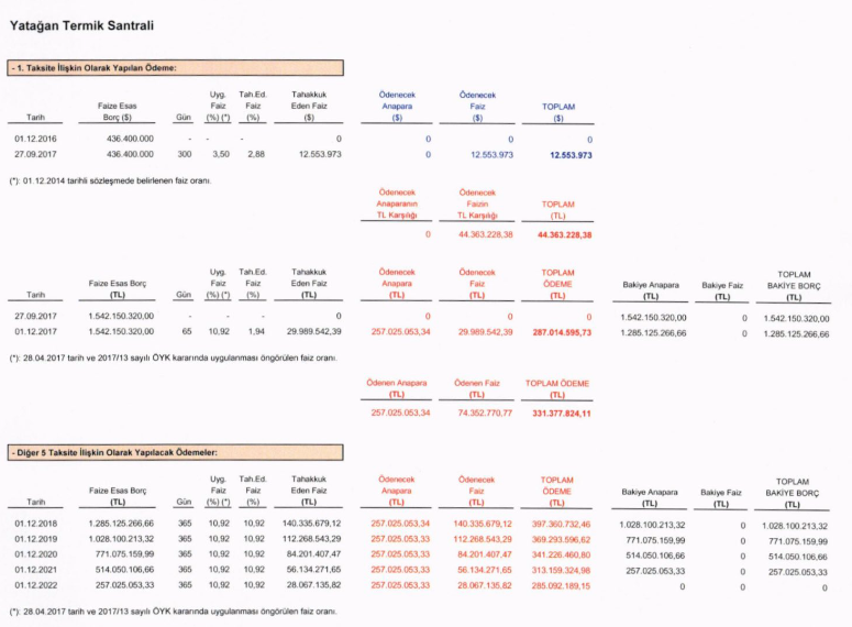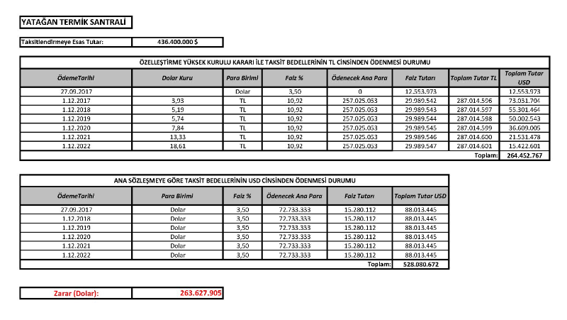 Yatağan Termik Santralindeki devlete olan ABD Doları cinsinden özelleştirme borçlarını TL’ye çevirip 6 taksit yaptığını tespit ettik.