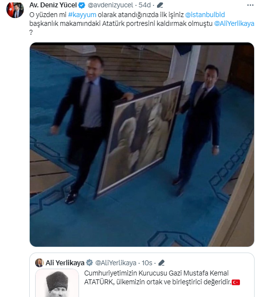 İçişleri Bakanı Ali Yerlikaya'nın Atatürk konusundaki hassasiyetini belirten mesajına CHP Sözcüsü Deniz Yücel'den ironi dolu bir paylaşımla cevap geldi. Ekrem İmamoğlu'nun kazandığı seçimin tekrarlandığı dönemde İstanbul Büyükşehir Belediyesi'ne Ali Yerlikaya'nın kayyum olarak atanmasını hatırlatan Deniz Yücel, Yerlikaya'nın ilk yaptığı işin başkanlık odasındaki Atatürk fotoğrafını kaldırmak olduğuna dikkat çekti.