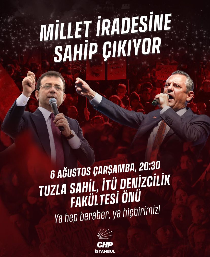 Mitingin duyurusunu yapan CHP İstanbul İl Başkanı Özgür Çelik, “Her mitingde büyüyen bir halk desteği var. Bu yalnızca Ekrem İmamoğlu için değil, sandığa, hukuka, demokrasiye sahip çıkmak içindir. Halkın dediği olur,” dedi.