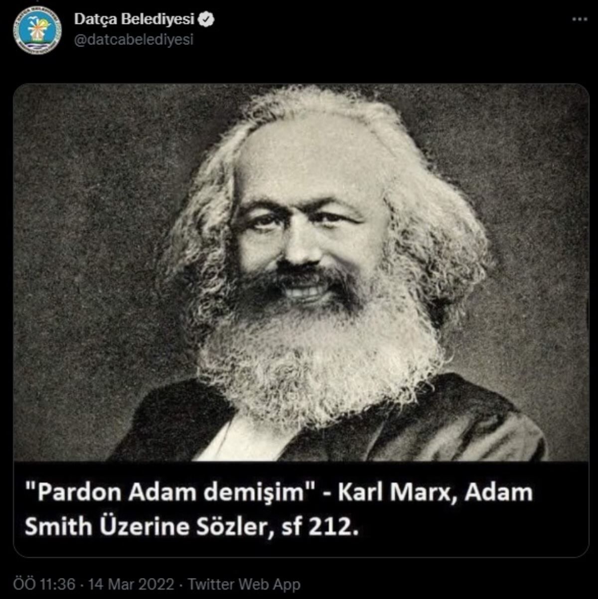 Fotoğraf, "'Dünyayı anlamak yetmez, onu değiştirmek gerekir.' Ekonomi, toplum bilimi, tarih, felsefe gibi birçok alanda fikirleriyle tüm dünyayı etkileyen filozof #KarlMarx 139 yıl önce bugün aramızdan ayrılmıştı. Saygıyla…" notu eşliğinde paylaşılmıştı.
