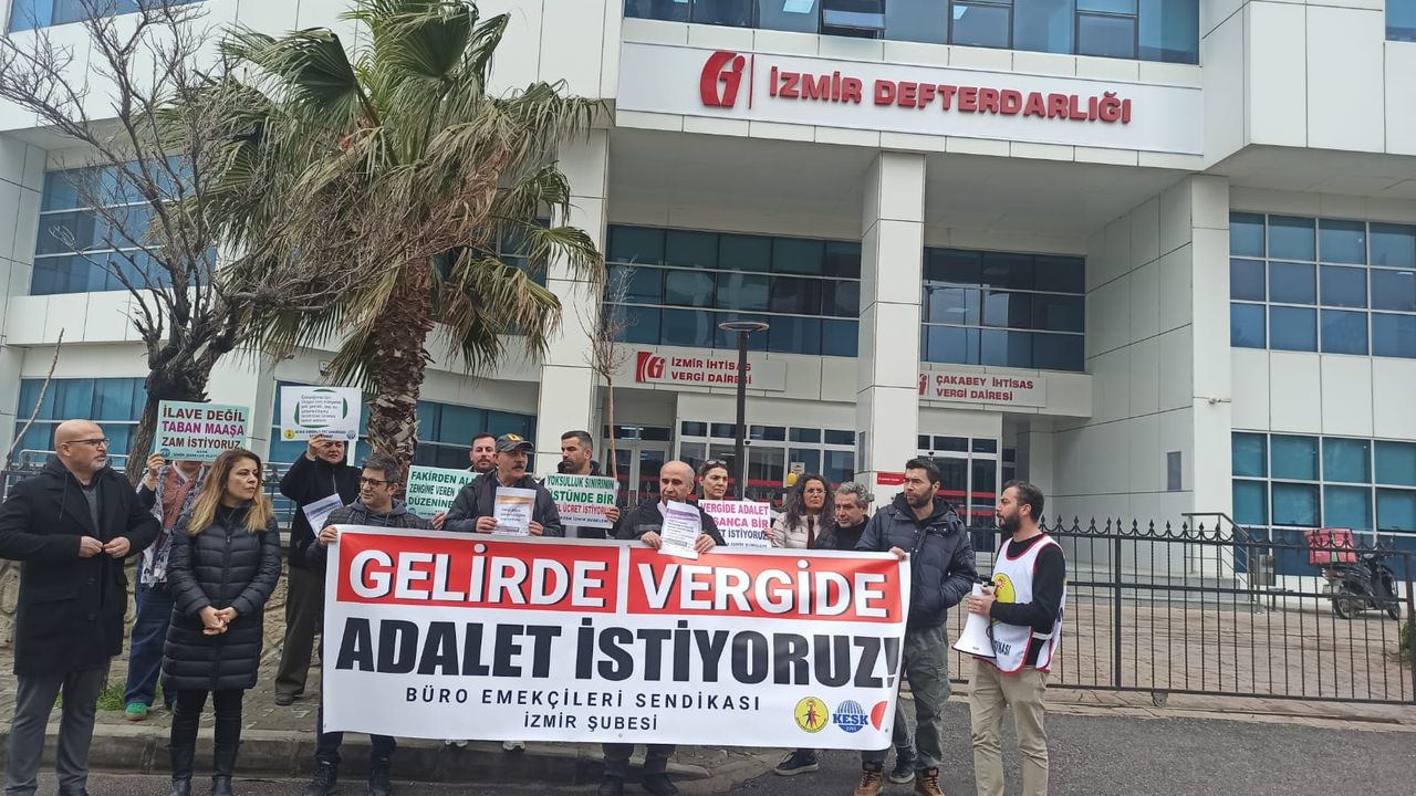 Son Mühür- Berivan Kaya/ Büro Emekçileri Sendikası (BES) İzmir Şubesi bugün İzmir Defterdarlığı önünde 36. Vergi Haftası'nı protesto etti.