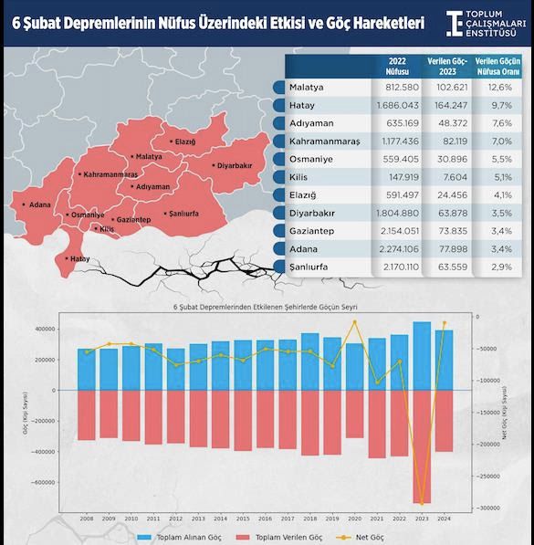 Toplum Çalışmaları Enstitüsü tarafından hazırlanan infografik, 6 Şubat 2023’te meydana gelen ve toplamda 11 ilde ağır yıkımlar yaşatan Kahramanmaraş merkezli depremlerin ardından depremden etkilenen illerde yaşanan göç hareketliliğini çarpıcı verilerle ortaya koydu.