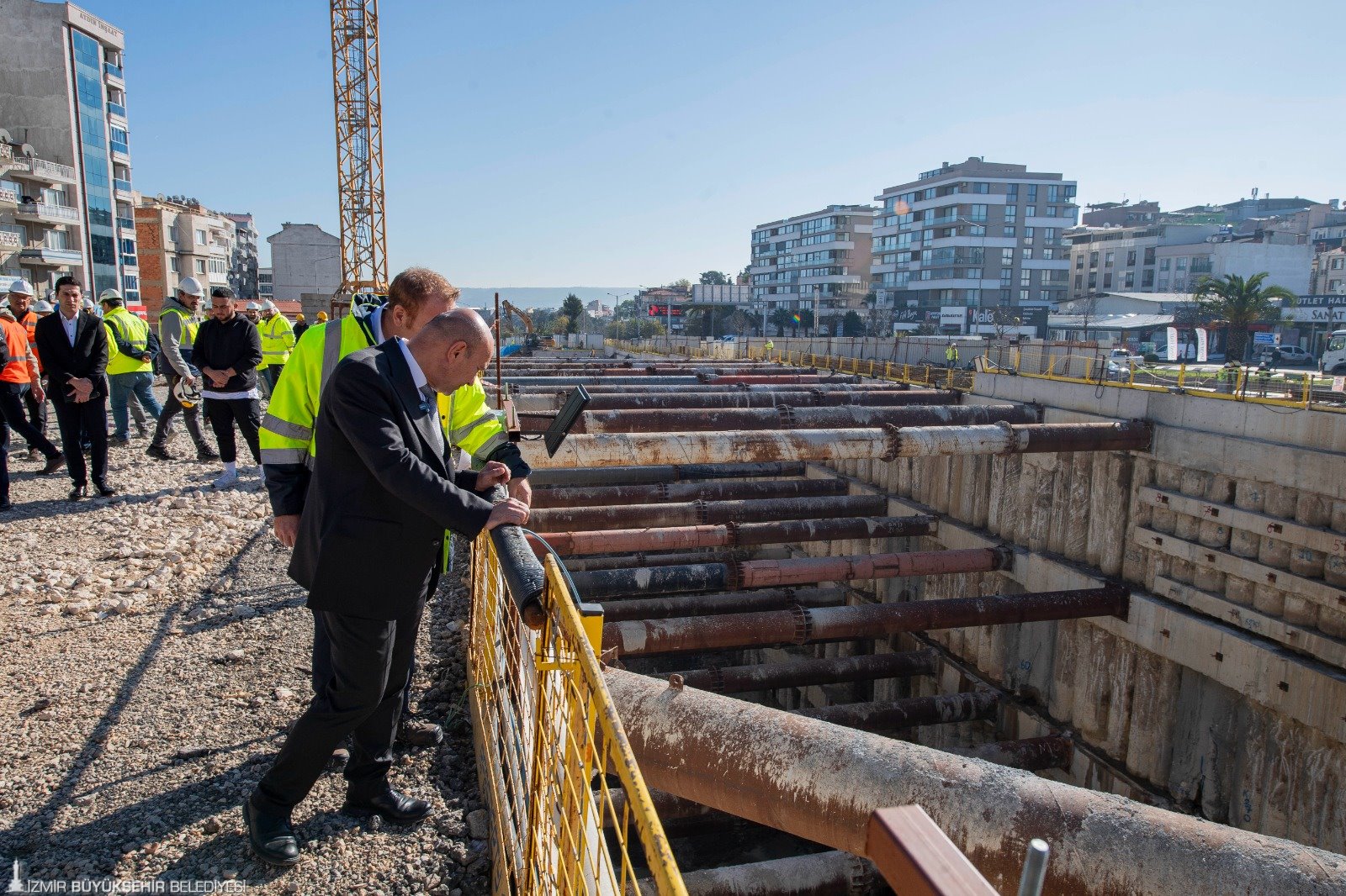 İzmir tarihinin en büyük raylı sistem yatırımı Buca Metrosu için bir süredir beklenen tünel açma makinesi TBM’ler General Asım Gündüz İstasyonu’ndan 36 metreyi bulan temel kazısına indirildi. Metro çalışmalarını önemli ölçüde hızlandıracak TBM’lerin indirildiği esnada şantiyede bulunan Başkan Tunç Soyer, “İzmir tarihinin en büyük projesinin belki de en tarihi anlarından birini şu anda yaşıyoruz. Bugüne kadar yapılan hazırlıkların aşama kaydettiğini ve bu noktaya geldiğini görmek hepimizi çok mutlu ediyor” dedi.