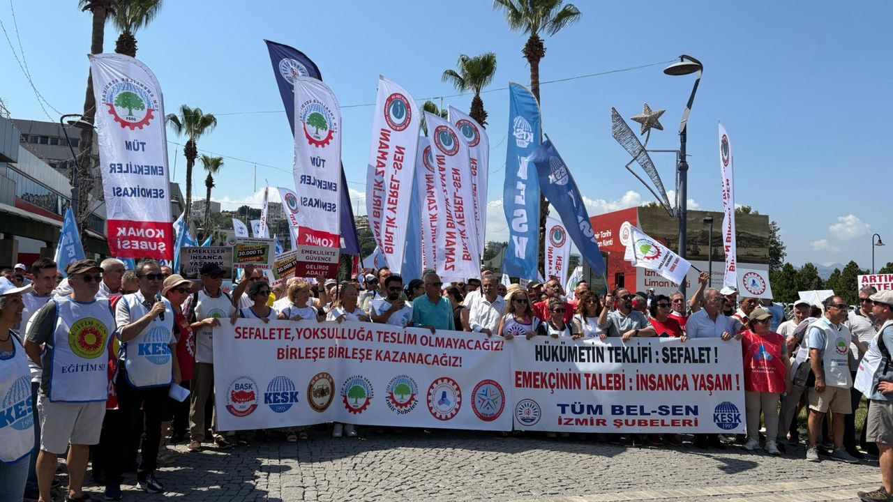 Birleşik Kamu-İş Konfederasyonu'nun öncülüğünde sendikaların aldığı ortak kararla, kamu emekçileri bugün düşük zam oranlarını protesto etmek için yurt genelinde iş bıraktı. Eyleme destek veren Tüm Yerel Sen Genel Örgütlenme Sekreteri Devrim Onur Erdağ, "Sefalet zammına hayır" diyerek başlayan açıklamasında, bu mücadelenin sadece sendika üyeleri için değil, Türkiye'de emek ve adalet arayışında olan herkes için bir simge olduğunu ifade etti. Eylemin, yıllardır süren yoksulluk ve sefalet koşullarına karşı onurlu bir direniş olduğunu vurgulayan Erdağ, İzmir'deki kamu emekçilerinin de Konak Meydanı'nda toplanarak haklarını talep ettiklerini ve yoksulluğa, adaletsizliğe karşı durduklarını tüm Türkiye'ye gösterdiklerini söyledi. Hükümetin 8. Dönem Toplu İş Sözleşmesi'nde sunduğu, kamu çalışanlarını yoksulluğa sürükleyecek teklifi kesin bir dille reddettiklerini yineledi.