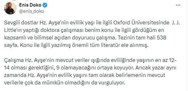 Enis Doko ayrıca, 'Hz. Ayşe'nin 9 yaşında Peygamberimizle evlendiği iddiası büyük ihtimal doğru değil. Konunun felsefi ve etik boyutu ise tartışılması gereken apayrı bir konu. Fırsatım olursa belki detaylı bir yazı ile kanaatlerimi paylaşacağım' ifadelerine yer verdi.