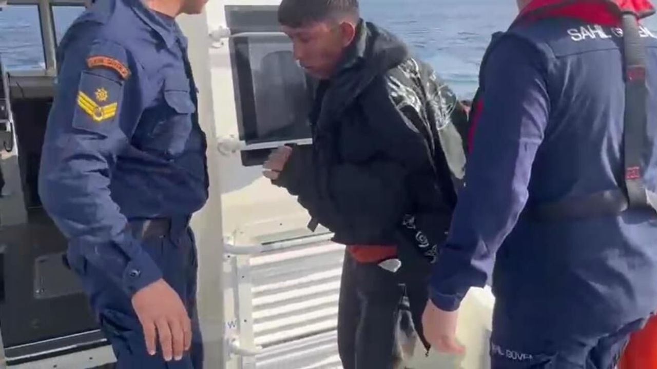 Ekiplerin yaptığı tarama sonucunda deniz yüzeyinde tespit edilen göçmen, güvenli şekilde bota alınarak kurtarıldı.