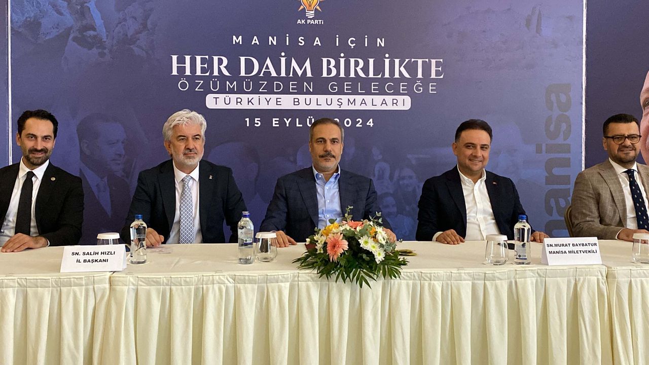Dışişleri Bakanı Hakan Fidan, bir dizi ziyaret kapsamında Manisa'ya geldi. Manisa Valiliği'ni ziyaret eden Bakan Fidan daha sonra AK Parti tarafından düzenlenen 'Şehir Buluşmaları' toplantısına katıldı. Manisa'ya gelen Bakan Fidan ilk olarak Valiliği ziyaret etti. Bakan Fidan'ın Manisa Valisi Enver Ünlü ile bir araya geldiği ziyaret, basına kapalı olarak gerçekleşti. Bakan Fidan daha sonra Yunusemre ilçesindeki bir otelde AK Parti tarafından düzenlenen 'Şehir Buluşmaları' toplantısında teşkilat ile buluştu. Bakan Fidan'a, AK Parti Manisa milletvekilleri Murat Baybatur, Tamer Akkal, Ahmet Mücahit Arınç da eşlik etti.