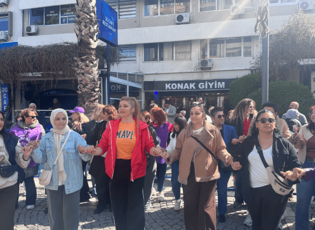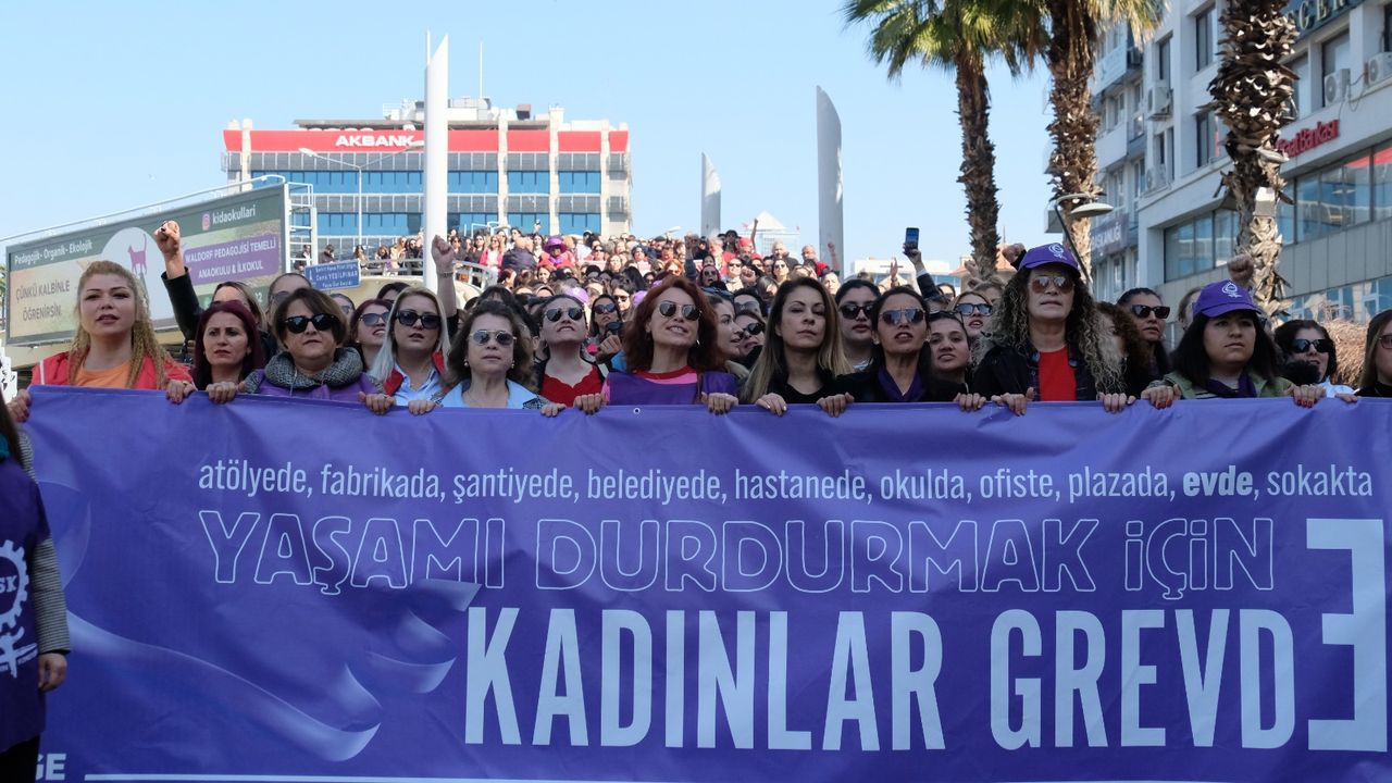 Son Mühür/ Gamze Eskiköy- Devrimci İşçi Sendikaları Konfederasyonu (DİSK), 8 Mart Dünya Emekçi Kadınlar Günü’nün anlam ve önemine dikkat çekmek için greve çıktı. Kadın işçiler, Konak Pier önünde bir araya gelerek taleplerini haykırdı. Sloganlarla Sosyal Güvenlik Kurumu’na yürüyen kadınlar, burada DİSK 9 No’lu Kadın Komisyonu Başkanı Seven Şen’in okuduğu basın açıklamasıyla seslerini yükseltti. Şen, “Eşitlik, adalet ve özgürlük için mücadelemizi sürdüreceğiz” diyerek kadın emeğinin sömürüsüne karşı tepkisini dile getirdi.