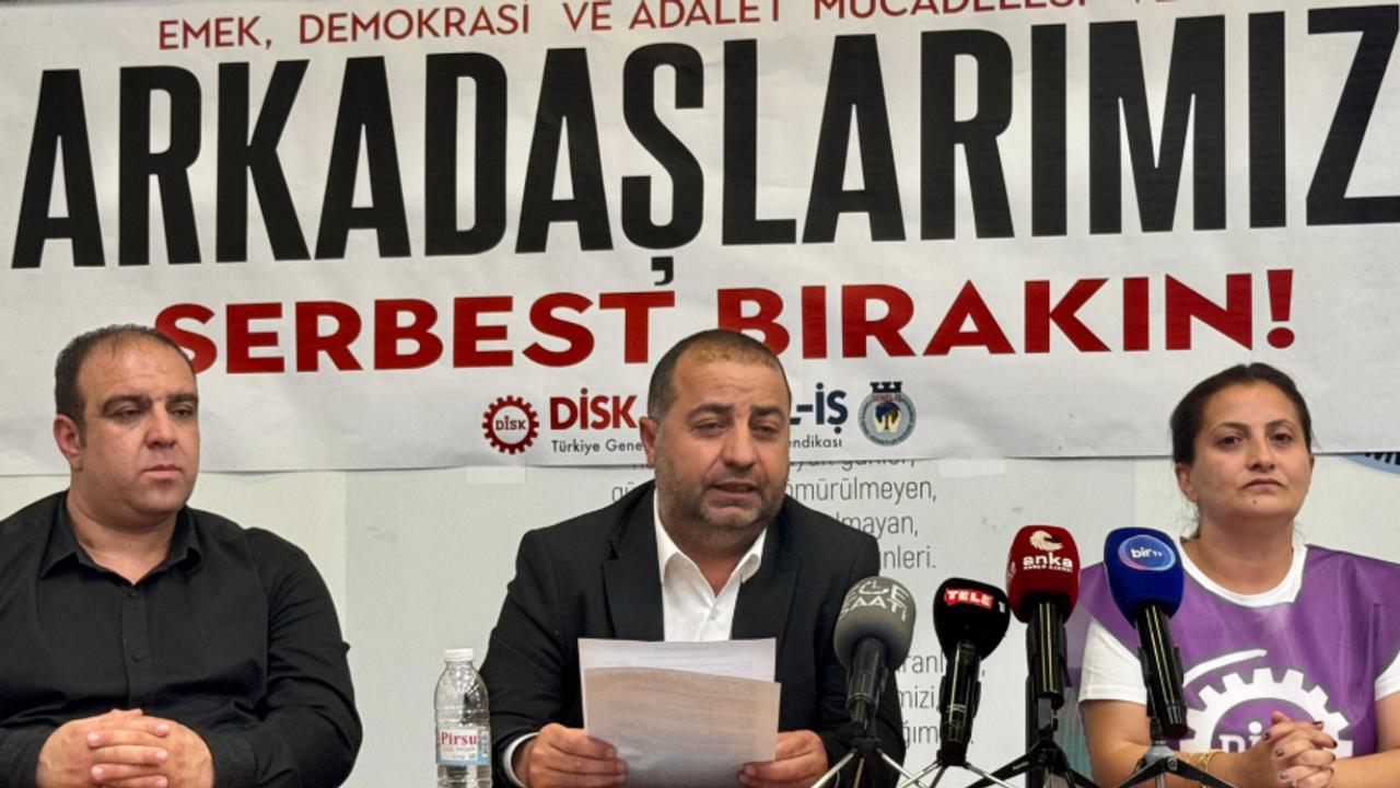 Deniz Şahin Gümüştekin ve Mine Bilir'in tutuklanmasının ardından DİSK Ege Bölge Temsilciliği'nde basın açıklaması gerçekleştirildi. Açıklamaya Genel İş Örgütlenme Dairesi Başkanı Ali Haydar Kaya, 3 Nolu Şube Başkanı Serap Yılmaz ve 8 Nolu Şube Sekreteri İlham Uluç ve şube başkanları katılım sağladı. Basın açıklamasını okuyan Ali Haydar Kaya, "İzmir'de, İstanbul Büyükşehir Belediye Başkanı Ekrem İmamoğlu'nun tutuksuz yargılanmasına yönelik bir basın açıklamasında, İzmir 8 No'lu Şube Başkanımız Deniz Şahin Gümüştekin ve İzmir 3 nolu şubemizin Kadın Komisyonu Başkanı Mine Bilir "Cumhurbaşkanına hakaret" suçlamasıyla tutuklanmıştır. Bu tutuklama sadece iki sendika yöneticisine değil, doğrudan sendikal hak ve özgürlüklere, ifade özgürlüğüne, kadın mücadelesine ve emek demokrasi mücadelesine yönelmiş açık bir gözdağıdır. Bu hukuksuz uygulama, ülkeyi yönetenlerin kendilerinden farklı düşünenleri bastırma ve örgütlü mücadeleyi sindirme çabalarının yeni bir örneğidir. Genel-İş, emek ve demokrasi mücadelesinin adıdır. Genel-İş Sendikası, tarihi boyunca yalnızca ekmek ve ücret için değil; adalet, eşitlik, özgürlük ve demokrasi için mücadele etmiştir. 19 Mart sonrası artan baskılar, yargının siyasallaşması ve toplumsal muhalefetin hedef haline getirilmesi karşısında sendikamız demokrasi için sesini yükseltmeye devam etmiştir. Bugün yaşananlar, bu direngen duruşun cezalandırılmasıdır. Arkadaşlarımızın talebi yalnızca adalet ve demokrasi olmuştur. İfade ettikleri düşünceler Anayasa'nın ve uluslararası sözleşmelerin tanıdığı ifade özgürlüğü kapsamında değerlendirilmelidir. Ancak siyasi iktidar, bu temel hakları dahi yok saymakta; muhalif olanı, örgütlü olanı cezalandırmak istemektedir" ifadelerine yer verdi.