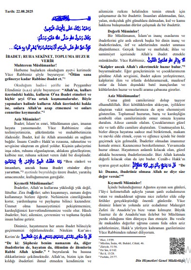‘’Bir Müslümanın, İslam’ın inanç esaslarını ve ibadetlerini göz ardı ederek başka bir dinin inanç ve ibadetlerinden, örf ve adetlerinden medet umması düşünülemez. Gerçek huzur ve mutluluk; ihlas ve samimiyet içerisinde Allah’a ibadet etmekle mümkündür.’’ Denilen hutbede,