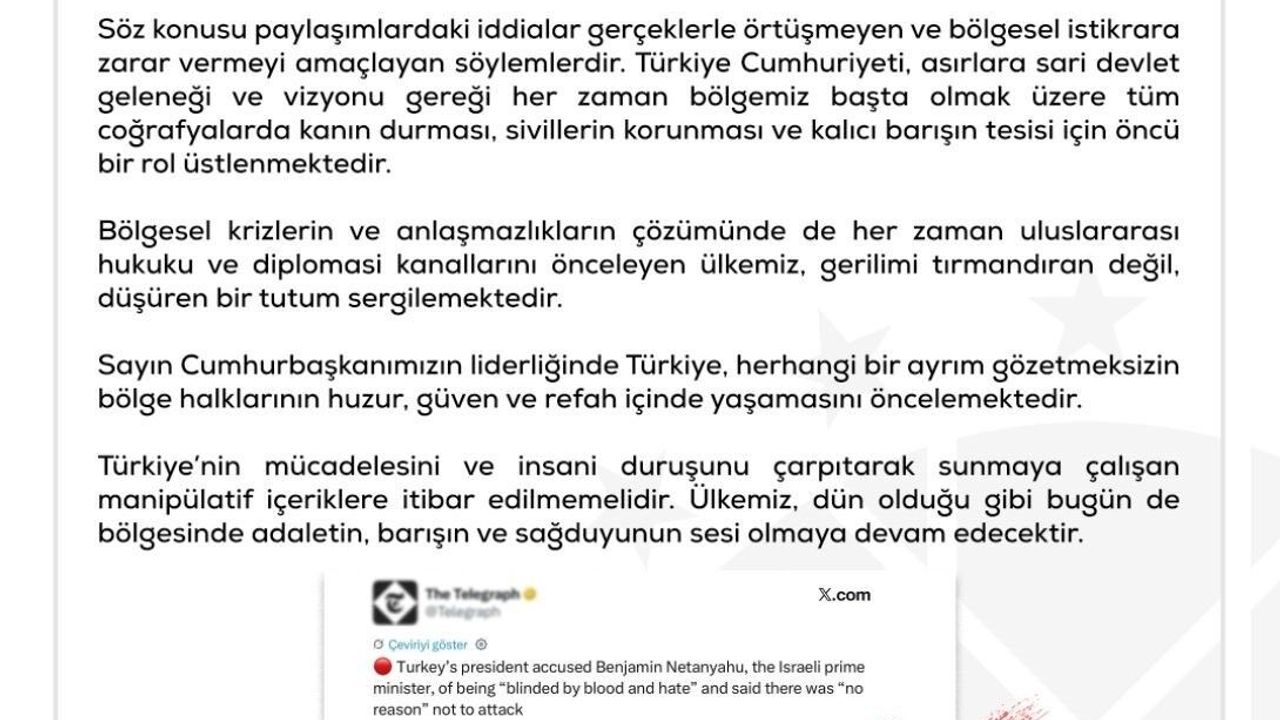 Türkiye’nin uluslararası hukuku ve diplomatik yolları öncelediğine dikkat çekilen açıklamada, gerilimi artıran değil düşüren bir politika izlendiği vurgulandı. Ayrıca, manipülatif içeriklere itibar edilmemesi çağrısı yapılarak Türkiye’nin bölgede adalet ve barışın sesi olmaya devam edeceği kaydedildi.