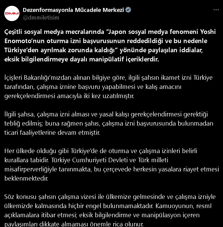 Son Mühür- Son dönemde çeşitli sosyal medya platformlarında, “Japon sosyal medya fenomeni Yoshi Enomoto’nun Türkiye’deki oturma izninin reddedildiği ve bu nedenle ülkeden ayrılmak zorunda kaldığı” iddiaları yayıldı. Dezenformasyonla Mücadele Merkezi, bu paylaşımların eksik ve manipülatif bilgiler içerdiğini açıkladı.