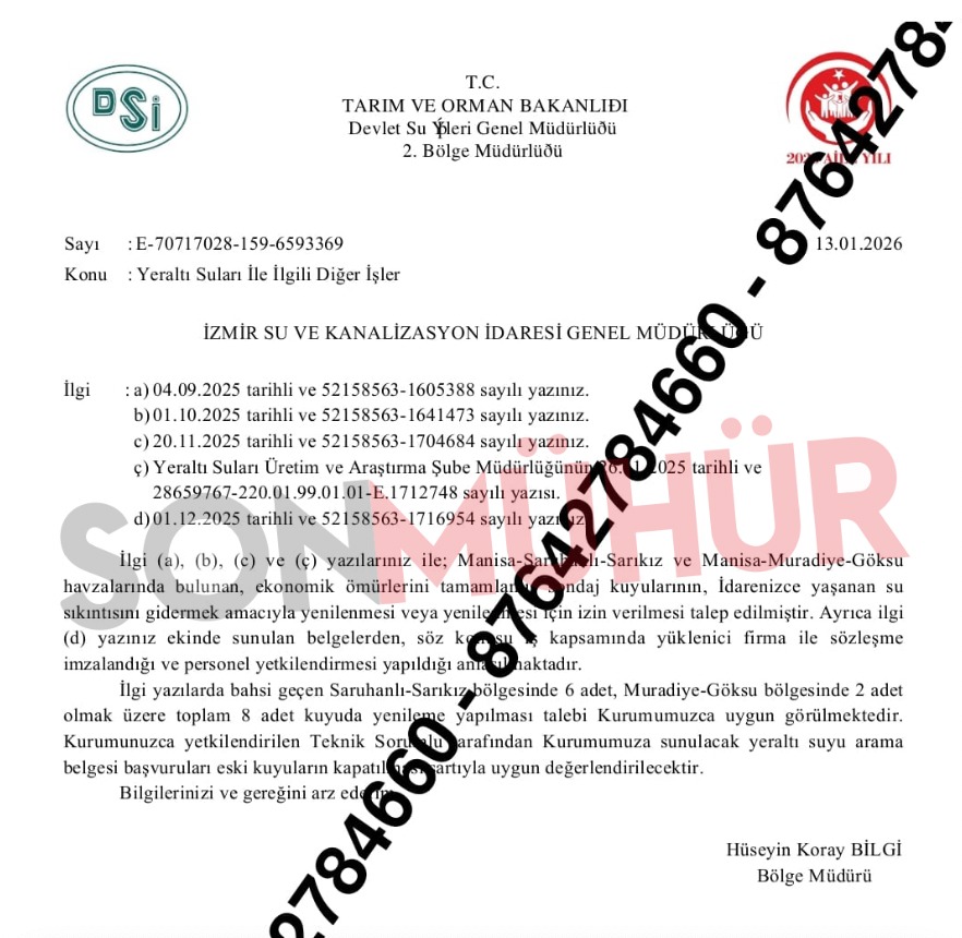 DSİ 2. Bölge Müdürlüğü’nün 13 Ocak 2026 tarihli yazısında, Manisa-Saruhanlı–Sarıkız ve Manisa-Muradiye–Göksu havzalarında bulunan, ekonomik ömrünü tamamlamış toplam 8 sondaj kuyusunun yenilenmesinin uygun görüldüğü bildirildi. Buna göre Saruhanlı–Sarıkız bölgesinde 6, Muradiye–Göksu bölgesinde ise 2 kuyunun yenilenmesine izin verilebileceği ifade edildi.