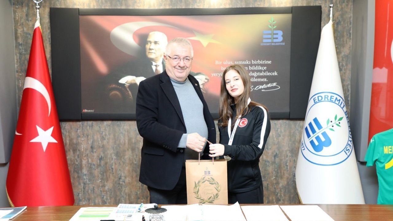 Türkiye Şampiyonluğu’nun ardından Edremit Belediye Başkanı Mehmet Ertaş’ı ziyaret eden Ecrin Yanıt, kazandığı altın madalyayı Başkan Ertaş’a takdim etti. Başkan Ertaş, genç sporcuyu tebrik ederek Edremit’i ve Türkiye’yi başarıyla temsil eden Ecrin Yanıt’a başarılarının devamını diledi.