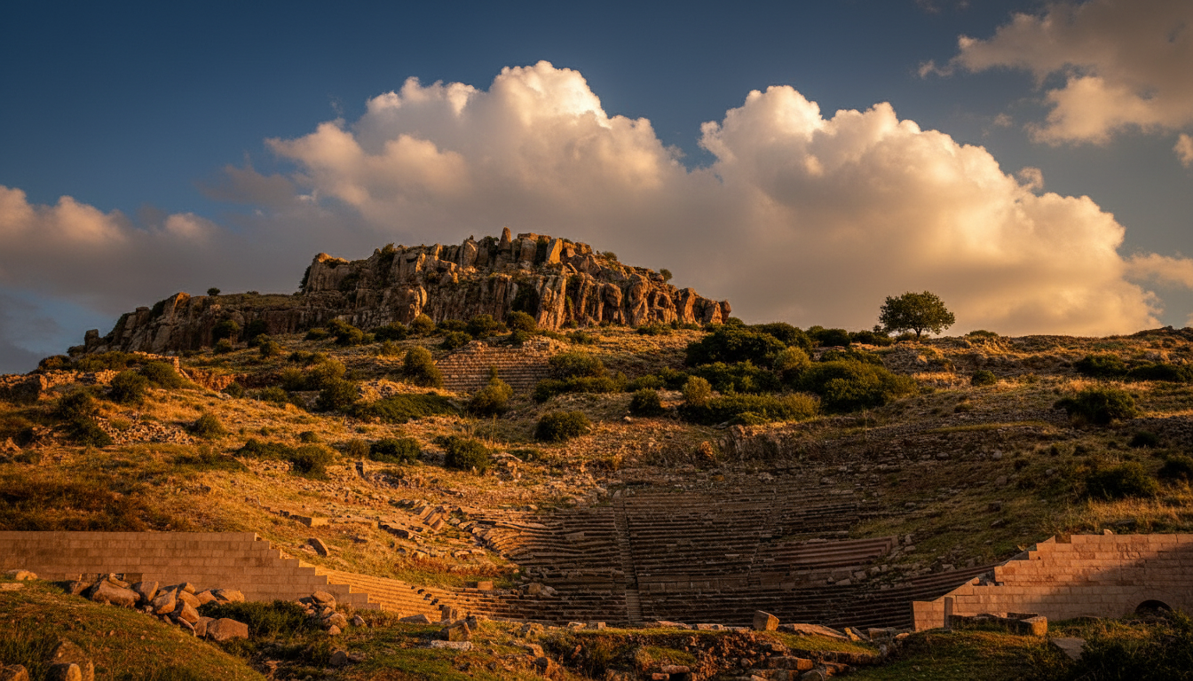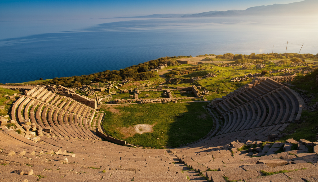 Assos’un bir diğer dikkat çekici yapısı olan Antik Tiyatro, yüzyıllara meydan okuyan taş basamaklarıyla bugün hâlâ dimdik ayakta. Bir zamanlar halkın buluşma noktası olan bu yapı, bugün deniz manzarasına karşı sessiz bir tanık gibi duruyor. Tiyatro basamaklarına oturup Ege’nin maviliğine karşı manzarayı seyretmek, ziyaretçilere hem tarihin hem doğanın huzurunu aynı anda yaşatıyor.