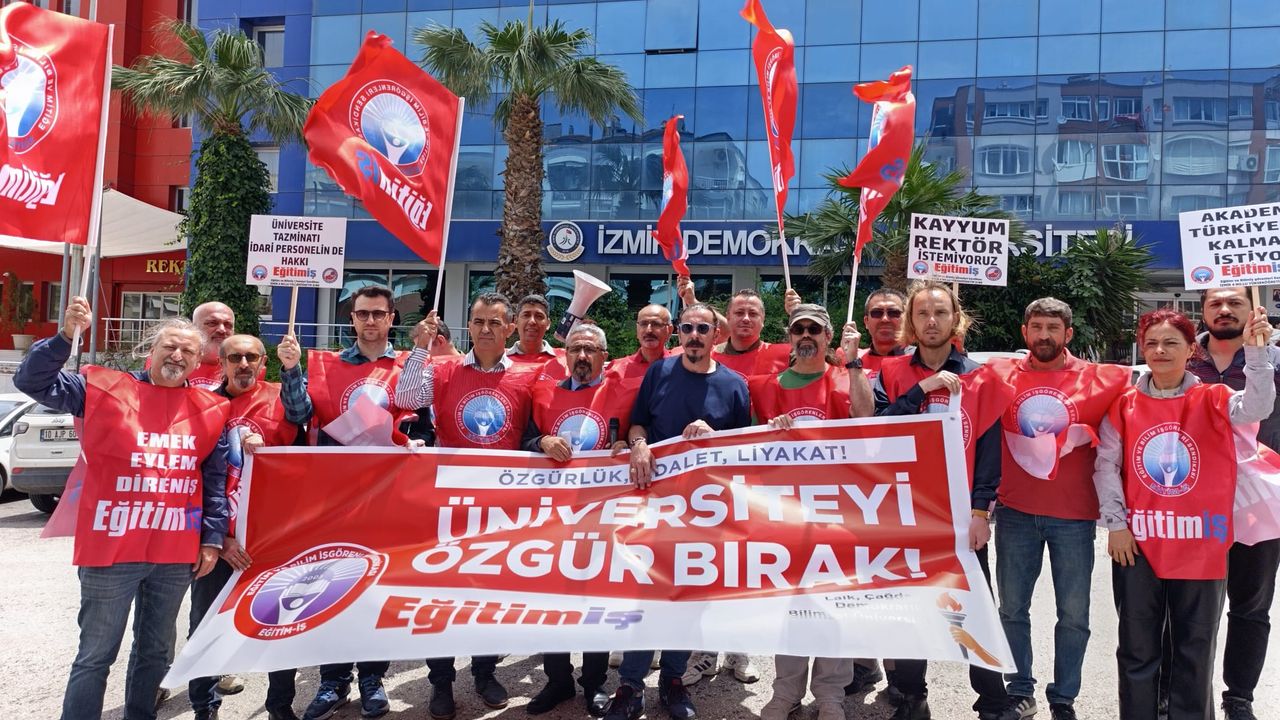 Son Mühür / Gamze Eskiköy - Eğitim-İş 4 No’lu Yüksek Öğretim Şubesi’ne bağlı öğretmenler üniversitelerdeki liyakat sorunu ve ticarileşen eğitime dikkat çekmek amacıyla İzmir Demokrasi Üniversitesi önünde basın açıklaması yaptı. Şube Başkanı Elbey Kale, akademik özerkliğin yok sayıldığını ve üniversitelerin bilim yerine rant ürettiğini söyledi.