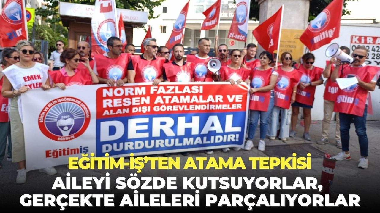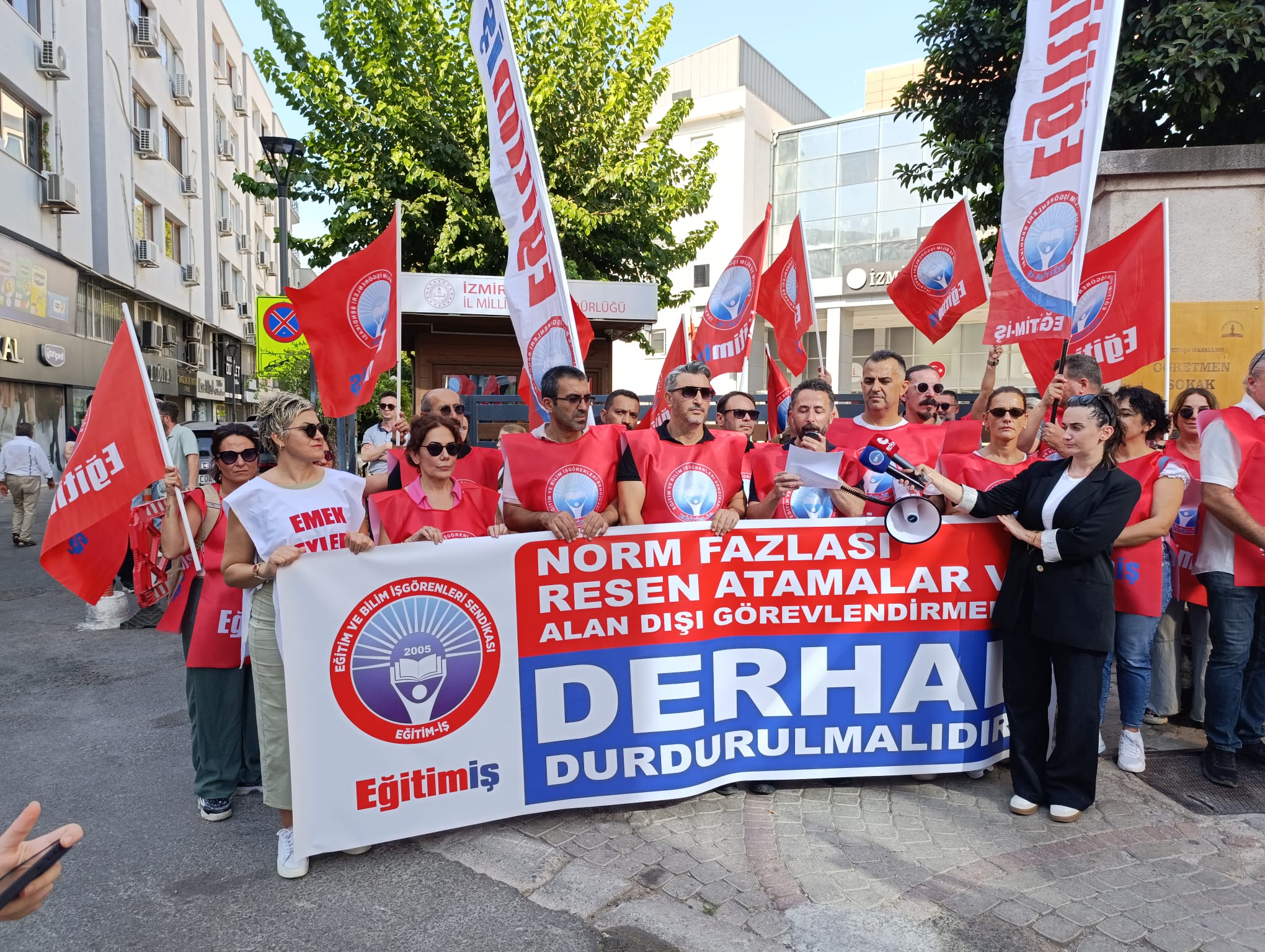 İzmir Eğitim-İş Yedi Numaralı Şube Başkanı Mustafa Gök tarafından okunan basın açıklamasında norm güncellemelerinin yapılmadığı, mevzuata aykırı şekilde “ilçe grubu” uygulamasına gidildiği ve öğretmenlerin yüzlerce kilometre uzağa gönderildiği belirtildi.