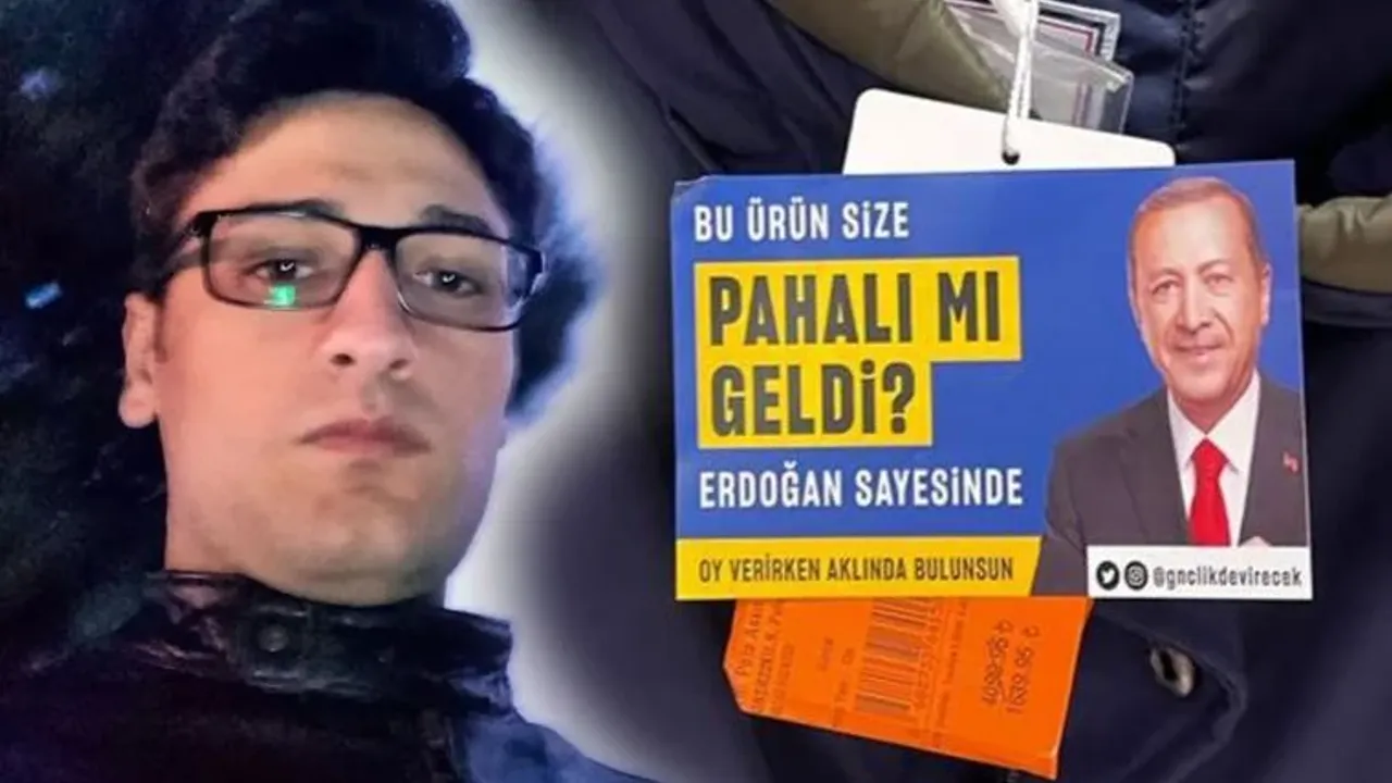 Akkoyun'un tasarladığı ve market raflarında çok sayıda ürüne yapıştırılan çıkartmalarda, AKP'li Cumhurbaşkanı Tayyip Erdoğan ve MHP Genel Başkanı Devlet Bahçeli'nin fotoğrafları görülüyordu.