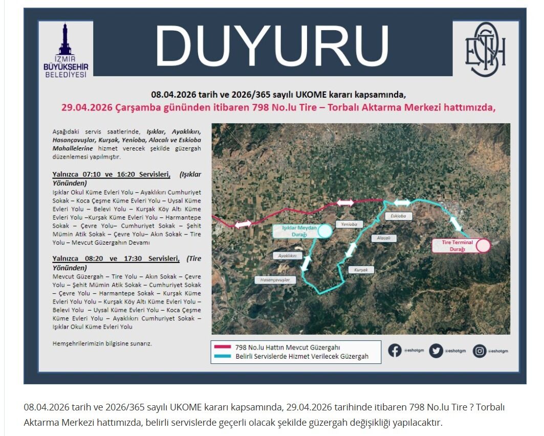 Öte yandan Tire ve Torbalı arasındaki 798 numaralı hatta ise Çarşamba günü (29 Nisan) devreye girecek ilginç bir düzenleme var. Işıklar ve Ayaklıkırı gibi mahallelere hizmet verecek olan belirli servis saatleri (07:10, 16:20 gibi) güzergahı biraz dolambaçlı hale getiriyor. Yolunuz bu taraflara düşerse saatinize bakmadan yola çıkmamanız önerilir.