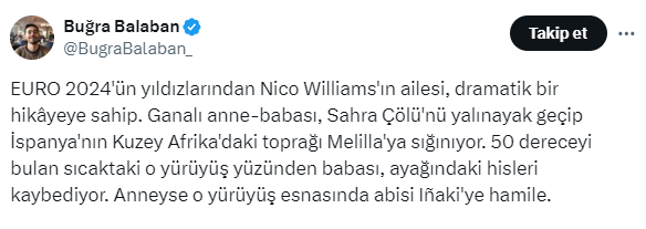 Hırvatistan ve İtalya karşısında ortaya koyduğu oyunla Euro 2024'ün yıldız adayları arasına giren Nico Williams'ın Gana'dan İspanya'ya uzanan hikayesi dikat çeken ayrıntılarla dolu. The Guardian'da yayınlanan Nico Williams yazısına göndermede bulunan spor spikeri Buğra Balaban, 'Euro 2024'ün yıldızlarından Nico Williams'ın ailesi, dramatik bir hikâyeye sahip' hatırlatmasında bulunarak şunları söyledi.
