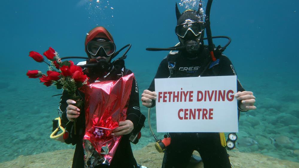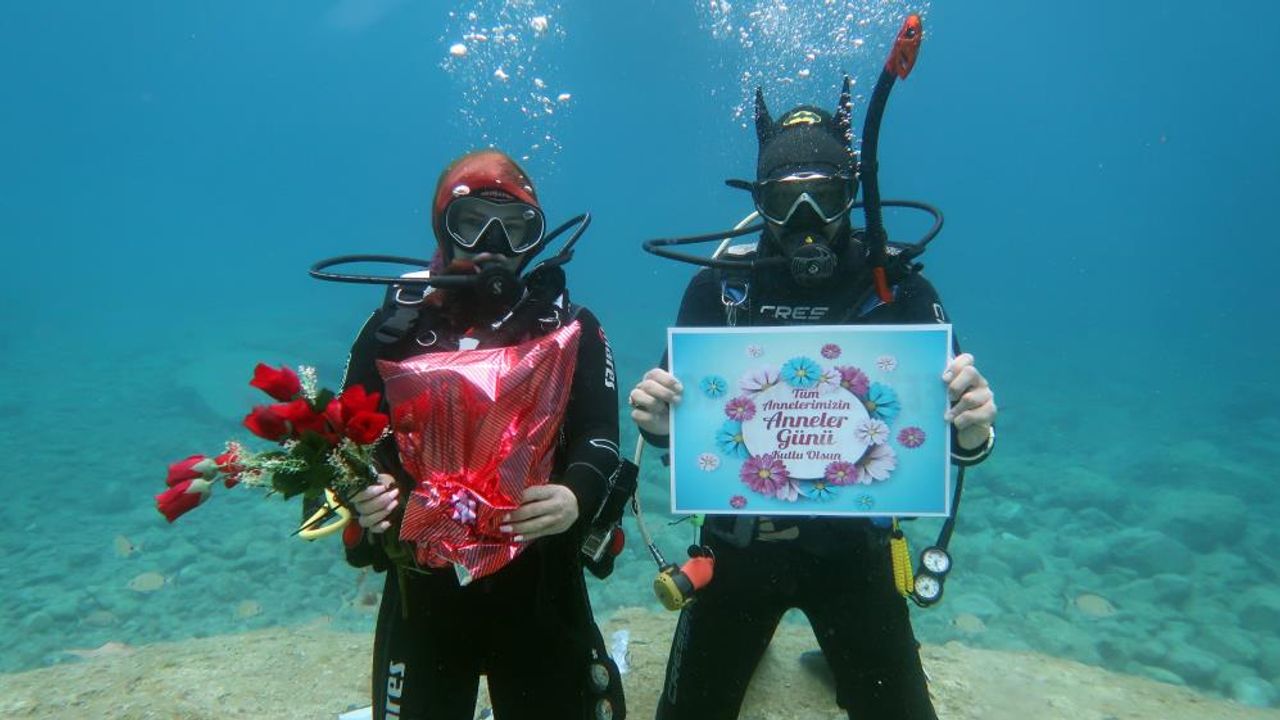 Muğla'nın Fethiye ilçesinde, denizin 5 metre derinliğine dalan dalgıçlar, Anneler Günü'nü özel bir etkinlikle kutladı. Sosyal sorumluluk projeleri ve farkındalık yaratma çalışmalarında adından söz ettiren Fethiye'li dalgıçlar, bu kez Anneler Günü'ne özel anlamlı bir etkinlik düzenledi.