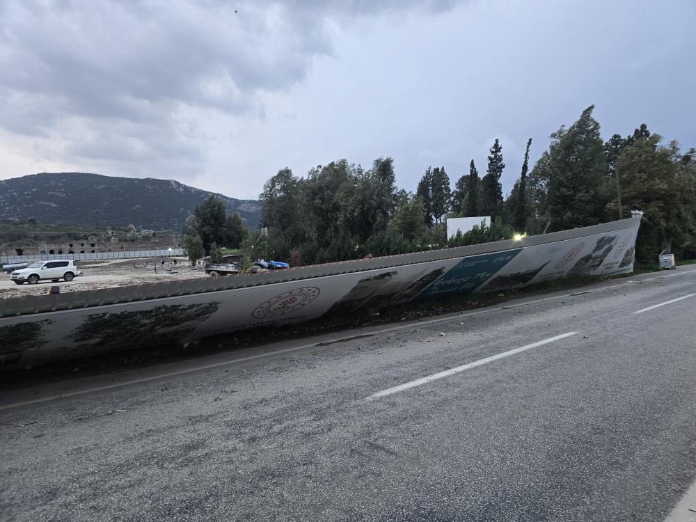 İzmir’in Selçuk ilçesinde etkili olan şiddetli fırtına, Kuşadası yolu üzerinde tehlikeli anlara neden oldu. Efes Antik Kenti yakınlarında yapımı süren Efes Karşılama Merkezi inşaat alanını çevreleyen büyük reklam panoları ve demir konstrüksiyonlar, kuvvetli rüzgârın etkisiyle anayola devrildi.