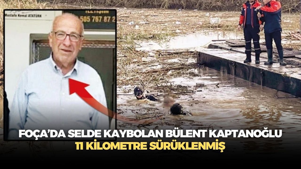 İzmir’in Foça ilçesinde perşembe günü etkili olan sağanak yağışın ardından sel sularına kapılarak kaybolan Bülent Kaptanoğlu (70) için yürütülen arama çalışmalarında acı haber geldi. Kaptanoğlu’nun cansız bedeni, düştüğü yerden 11 kilometre aşağıda, Gediz Nehri üzerindeki sazlık bölgede bulundu.