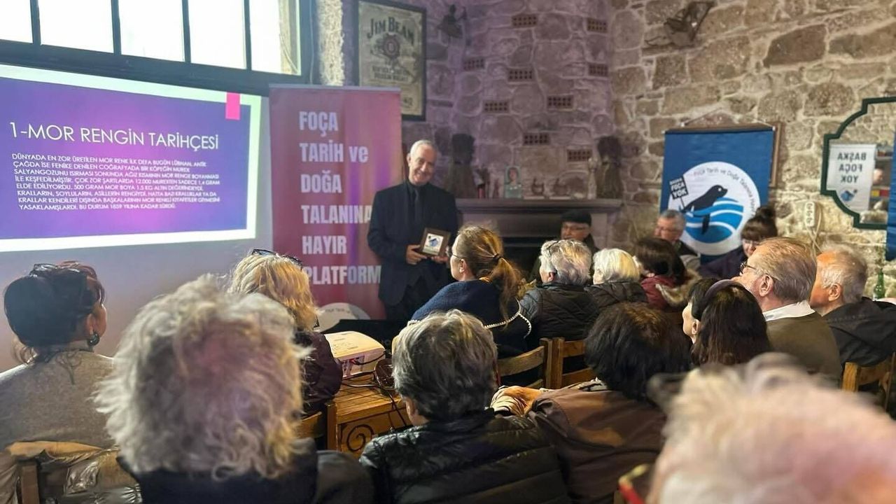 Katılımcılar, Foça’nın tarihi kimliğinin önemli bir parçası olan mor rengin geçmişine dair kapsamlı bir anlatımı ilgiyle takip etti.