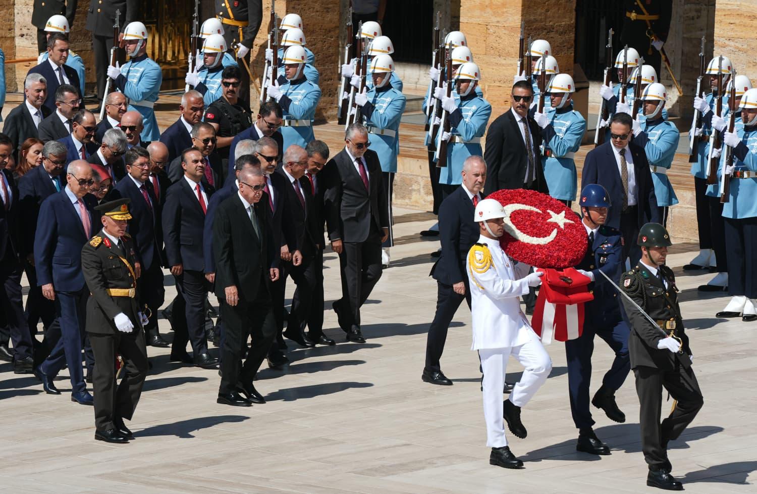 Tören, devlet erkanının Aslanlı Yol’dan yürüyüşüyle başladı. Cumhurbaşkanı Recep Tayyip Erdoğan’ın başkanlık ettiği kortejde; TBMM Başkanı Numan Kurtulmuş, Cumhurbaşkanı Yardımcısı Cevdet Yılmaz, Cumhurbaşkanlığı Kabinesi üyeleri, CHP Genel Başkanı Özgür Özel, MHP Genel Başkanı Devlet Bahçeli, İYİ Parti Genel Başkanı Müsavat Dervişoğlu, yüksek yargı başkanları, komutanlar, siyasi parti temsilcileri ve bürokratlar yer aldı.