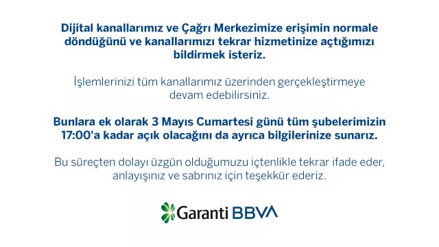 Erişim sorunu karşılığında, Garanti BBVA tüm şubelerinin 3 Mayıs günü saat 17.00'ye kadar açık olacağını da duyurdu. Banka, yaptığı açıklamada, "Bu süreçten dolayı üzgün olduğumuzu içtenlikle tekrar ifade eder, anlayışınız ve sabrınız için teşekkür ederiz" dedi. Ayrıca, 3 Mayıs Cumartesi günü de tüm şubelerin aynı saatlere kadar açık olacağı bildirildi.