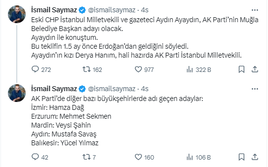 AK Parti'nin 7 Ocak pazar günü İstanbul Büyükşehir adayının kim olacağını duyurmasının ardından gözler diğer illere çevirildi. Gazeteci İsmail Saymaz sosyal medyadan paylaştığı mesajlarında İzmir için Hamza Dağ isminin önde olduğunu öne sürdü. İsmail Saymaz, AK Parti'nin, Muğla belediye başkan adaylığı için de eski CHP'li bir isme teklif götürdüğünü ve teklifin kabul edildiğini duyurdu. Saymaz paylaşımında, "Eski CHP İstanbul Milletvekili ve gazeteci Aydın Ayaydın, AK Parti’nin Muğla Belediye Başkan adayı olacak. Ayaydın ile konuştum. Bu teklifin 1,5 ay önce Erdoğan’dan geldiğini söyledi. Ayaydın’ın kızı Derya Hanım, hali hazırda AK Parti İstanbul Milletvekili" ifadelerini kullandı.