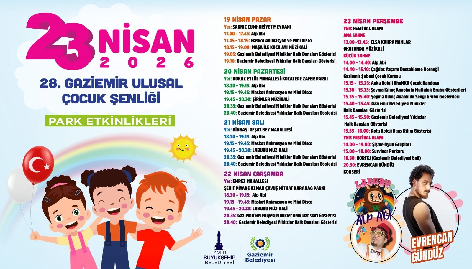 19-23 Nisan tarihleri arasında gerçekleşecek olan 28. Gaziemir Ulusal Çocuk Şenliğinde çeşit çeşit etkinlikler olacak. Kültürel anlamda zenginleştirilmiş şenliğin sonunda Evrencan Gündüz sahne alacak.