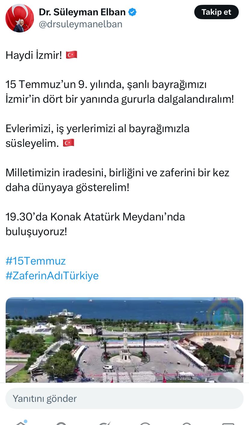 “Haydi İzmir! 15 Temmuz’un 9. yılında, şanlı bayrağımızı İzmir’in dört bir yanında gururla dalgalandıralım! Evlerimizi, iş yerlerimizi al bayrağımızla süsleyelim. Milletimizin iradesini, birliğini ve zaferini bir kez daha dünyaya gösterelim! 19.30’da Konak Atatürk Meydanı’nda buluşuyoruz!”
