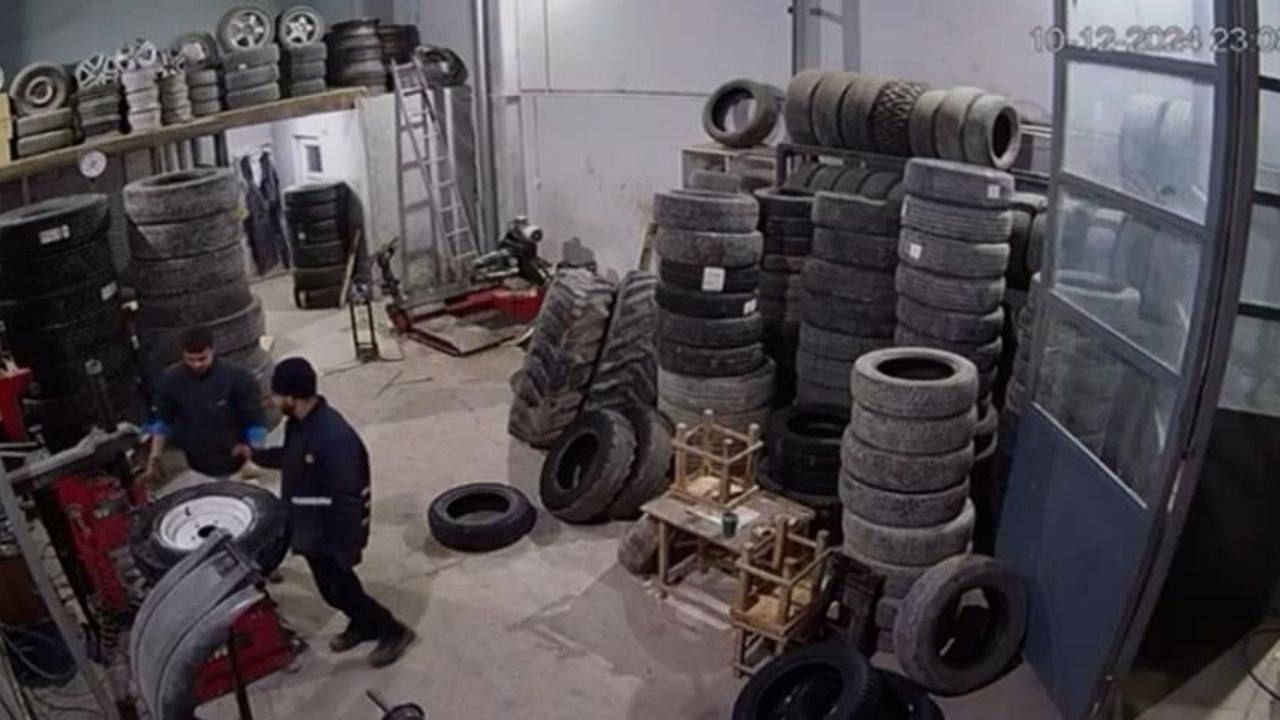 Patlama, iş yerindeki güvenlik kameralarına anbean kaydedildi. Görüntülerde, çalışanların lastiği şişirme işlemine başladığı sırada ani bir patlama sesi duyuluyor.
