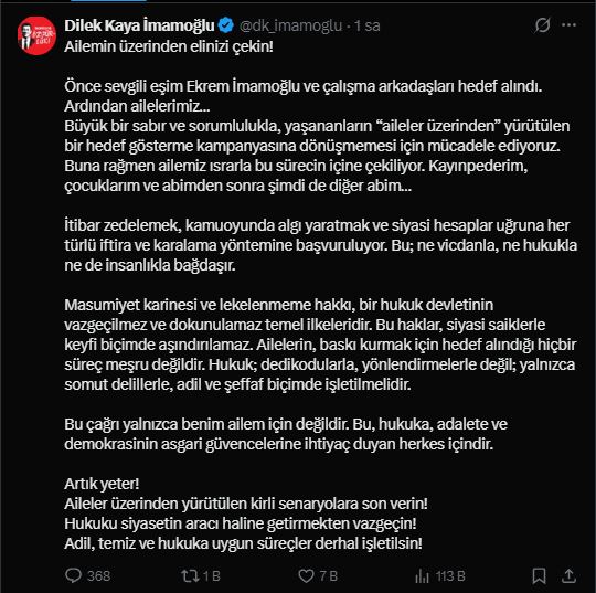 Açıklamasının yalnızca kendi ailesine yönelik olmadığını ifade eden İmamoğlu, hukuka ve adalete ihtiyaç duyan herkes adına konuştuğunu belirtti. Hukukun siyasetin aracı haline getirilmemesi gerektiğini vurguladı.