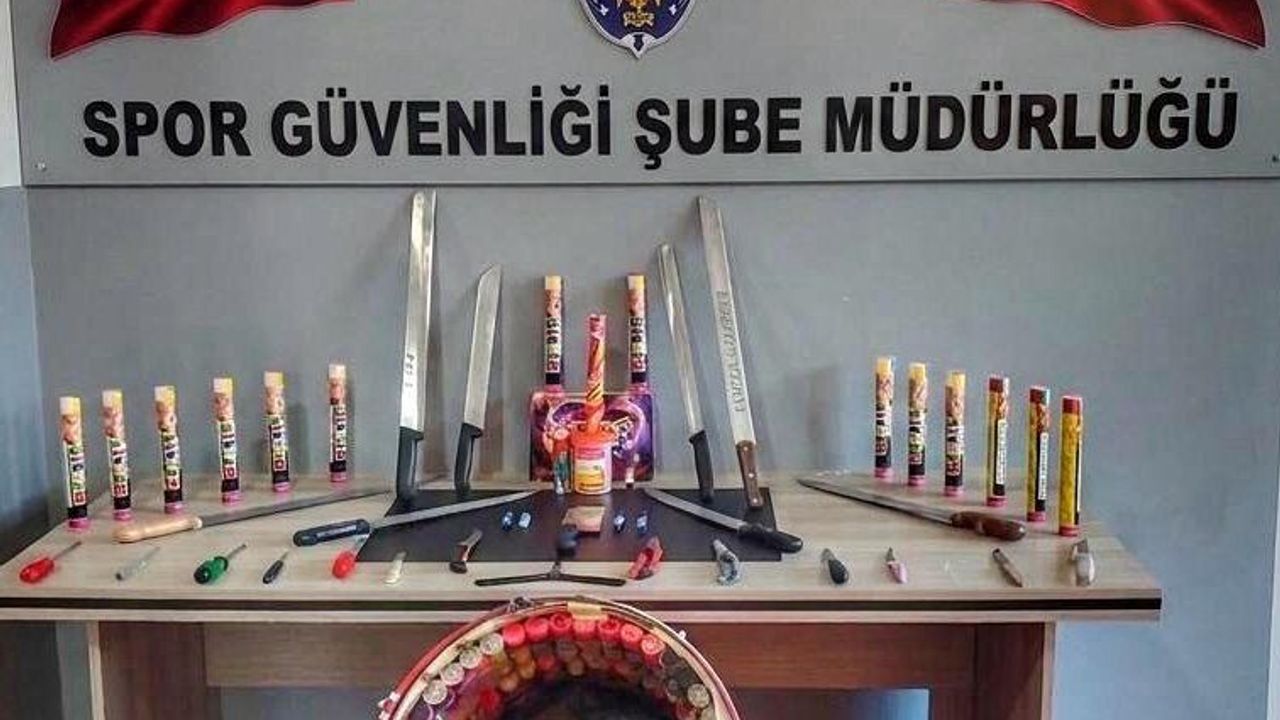 Denetimler sırasında Göztepe taraftarlarına ait olduğu belirlenen malzemeler dikkat çekti. Güvenlik güçleri tarafından; 80’i davul içine gizlenmiş olmak üzere toplam 96 meşale, 130 maytap, 1 yoğun sis bombası, 8 döner bıçağı, 1 satır, 14 bıçak ve çeşitli kesici-delici aletler bulundu.