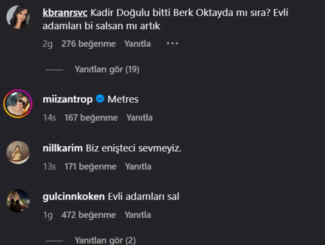 Tartışmaların merkezindeki isim Gülsim Ali ise olaylara dair herhangi bir açıklama yapmadı. Ancak oyuncunun günler önce yaptığı paylaşımların altına çiftin hayranlarından tepkiler yağdı. Yorumlarda “Evli adamları rahat bırak” ve “Evli erkeklere mesaj atmaya utanmıyor musun?” gibi sert ifadeler dikkat çekti.