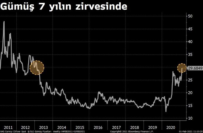 Gümüş vadeli kontratları, Reddit kullanıcılarının akımıyla geçen haftayı neredeyse yüzde 6 yükselişle kapatmıştı. Geçtiğimiz yılı yüzde 50’ye yakın yükselişle kapatan gümüş, yıllık performansta altını ikiye katlamıştı.