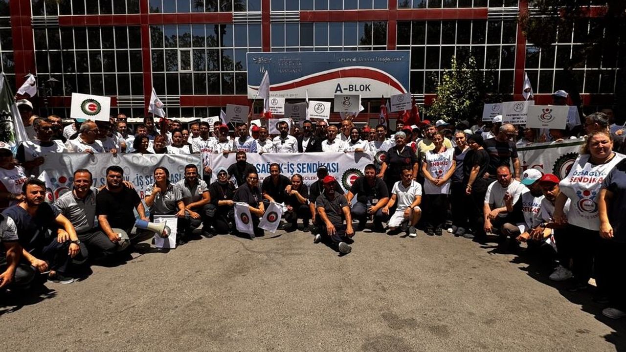 Tepecik Eğitim ve Araştırma Hastanesi önünde toplanan çalışanlar, taleplerini dile getiren sloganlarla açıklamaya destek verdi.