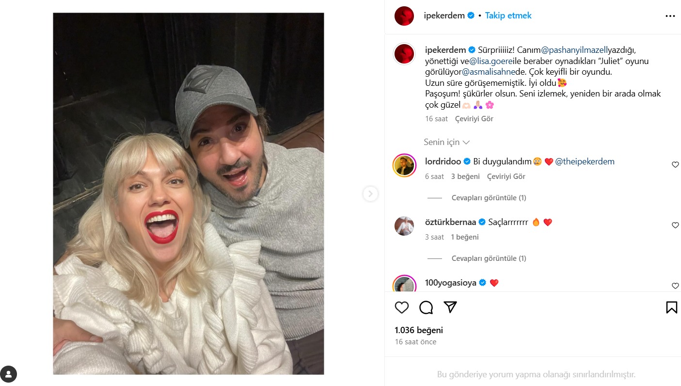 İpek Erdem, Yılmazel ile çekildiği fotoğrafı sosyal medya hesabından paylaşarak, "Sürpriz! Canım Paşhan Yılmazel'in yazdığı, yönettiği ve Tuana Goere ile beraber oynadıkları Juliet oyununu izledim" notunu düştü. Erdem, paylaşımında şu ifadelere yer verdi: "Uzun zamandır görüşememiştik. İyi oldu Paşoşum! Şükür kavuşturana. Seni seyretmek, yeniden bir arada olmak çok güzel"