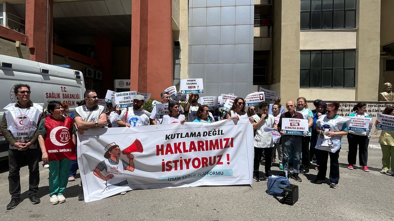 Son Mühür- Berivan Kaya/ 12 Mayıs Hemşireler Günü’nde hemşirelerin sorunları yeniden gündeme geldi. İzmir Sağlık Platformu İzmir Atatürk Eğitim ve Araştırma Hastanesi Başhekimliği önünde eylem gerçekleştirildi. Basın açıklamasını Sağlık Platformu adına Sağlık Emekçileri Sendikası( SES) İzmir 1 Nolu Şube Başkanı Hava Akcan okudu.