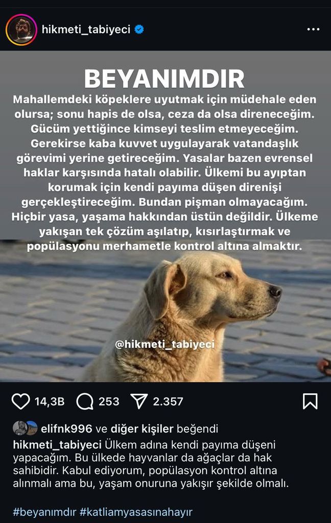 Bolat, paylaşımına “Ülkem adına kendi payıma düşeni yapacağım. Bu ülkede hayvanlar da ağaçlar da hak sahibidir. Kabul ediyorum, popülasyon kontrol altına alınmalı ama bu, yaşam onuruna yakışır şekilde olmalı” notunu da düştü.